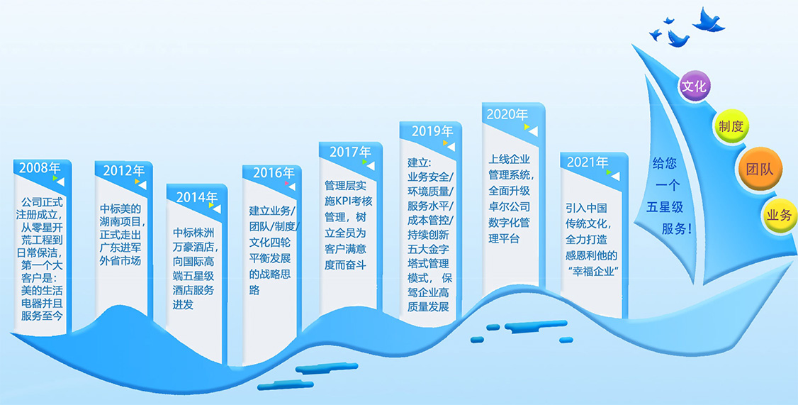 中山市卓爾清潔服務(wù)有限公司成立于2008年,經(jīng)過(guò)10多年的奮斗累積,形成了具有自身特色的經(jīng)營(yíng)管理體系,在市場(chǎng)上樹(shù)立了“卓爾五星級(jí)服務(wù)”的優(yōu)秀品牌形象,連續(xù)7年被評(píng)為“廣東省十佳優(yōu)質(zhì)服務(wù)企業(yè)”、“廣東省清潔服務(wù)行業(yè)知名品牌”、“廣東省十佳重合同守信用企業(yè)”。業(yè)務(wù)范圍涵蓋保潔綠化、物業(yè)管理、市政環(huán)衛(wèi)、倉(cāng)儲(chǔ)管理、勞務(wù)派遣、環(huán)境工程、設(shè)備銷(xiāo)售等服務(wù)區(qū)域已輻射到廣東、湖南、貴州、河北、浙江等全國(guó)23個(gè)城市,分別與恒大、碧桂園、萬(wàn)科、佳兆業(yè)、旭輝、新城控股、深業(yè)集團(tuán)、華潤(rùn)、美的、達(dá)能等多家世界500強(qiáng)企業(yè)成為長(zhǎng)年戰(zhàn)略合作伙伴。卓爾人懷著“呵護(hù)人類(lèi)清潔綠色環(huán)境”的使命在努力揚(yáng)帆起航!